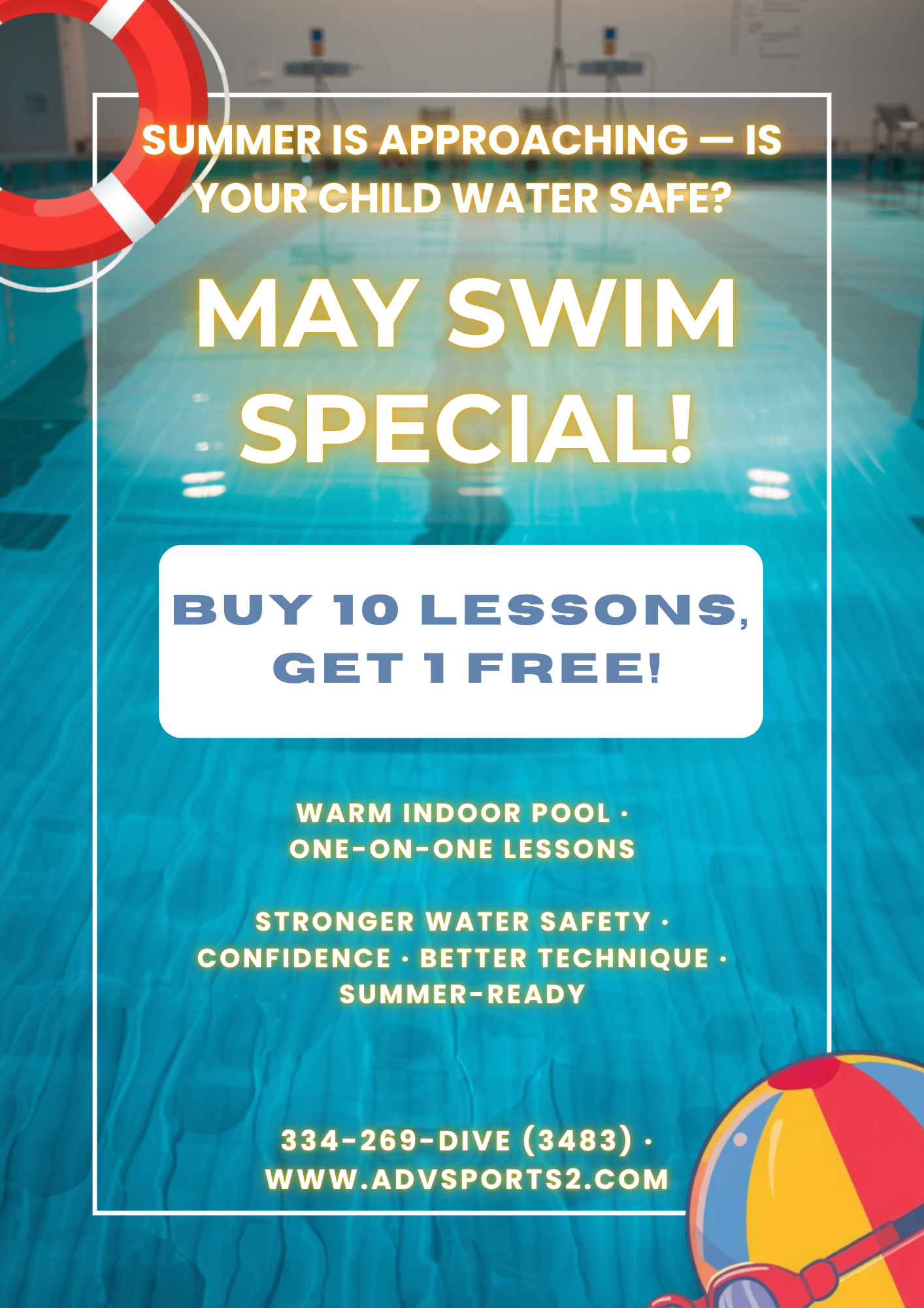 May swim lesson special: buy 10 lessons, get 1 free!